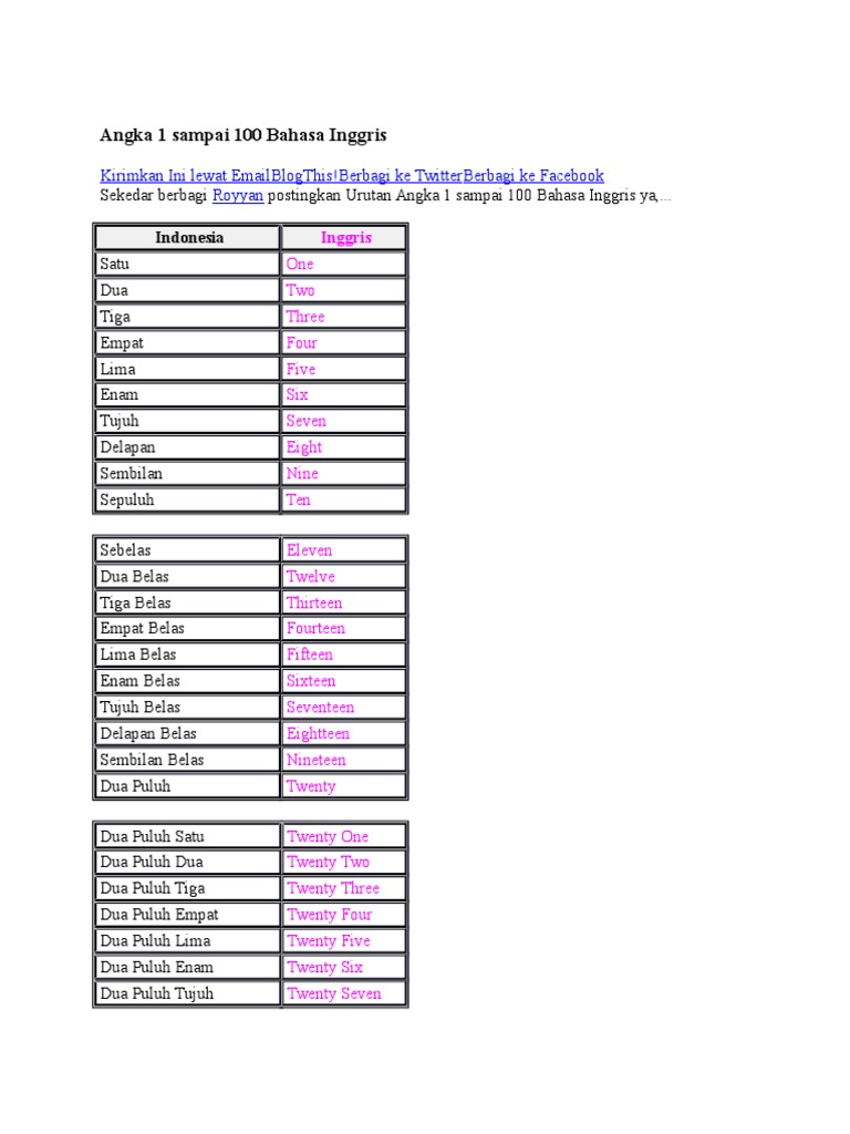 Angka 1 Sampai 100 / 0 ratings0% found this document useful (0 votes).. Assalamu'alaikum wr.wb maaf ms sya mau nyaranin. Yang harus diperhatikan dalam penulisan angka dalam bahasa inggris adalah menghapalkan angka 1 hingga 12, dan kemudian bahasa inggris untuk belasan (teen) dan puluhan (ty). Sekedar berbagi royyan postingkan urutan angka 1 sampai 100 bahasa inggris ya Belajar angka menjadi tema utama untuk bahasa inggris sd. Home » blog tips » angka 1 sampai 100 bahasa inggris.